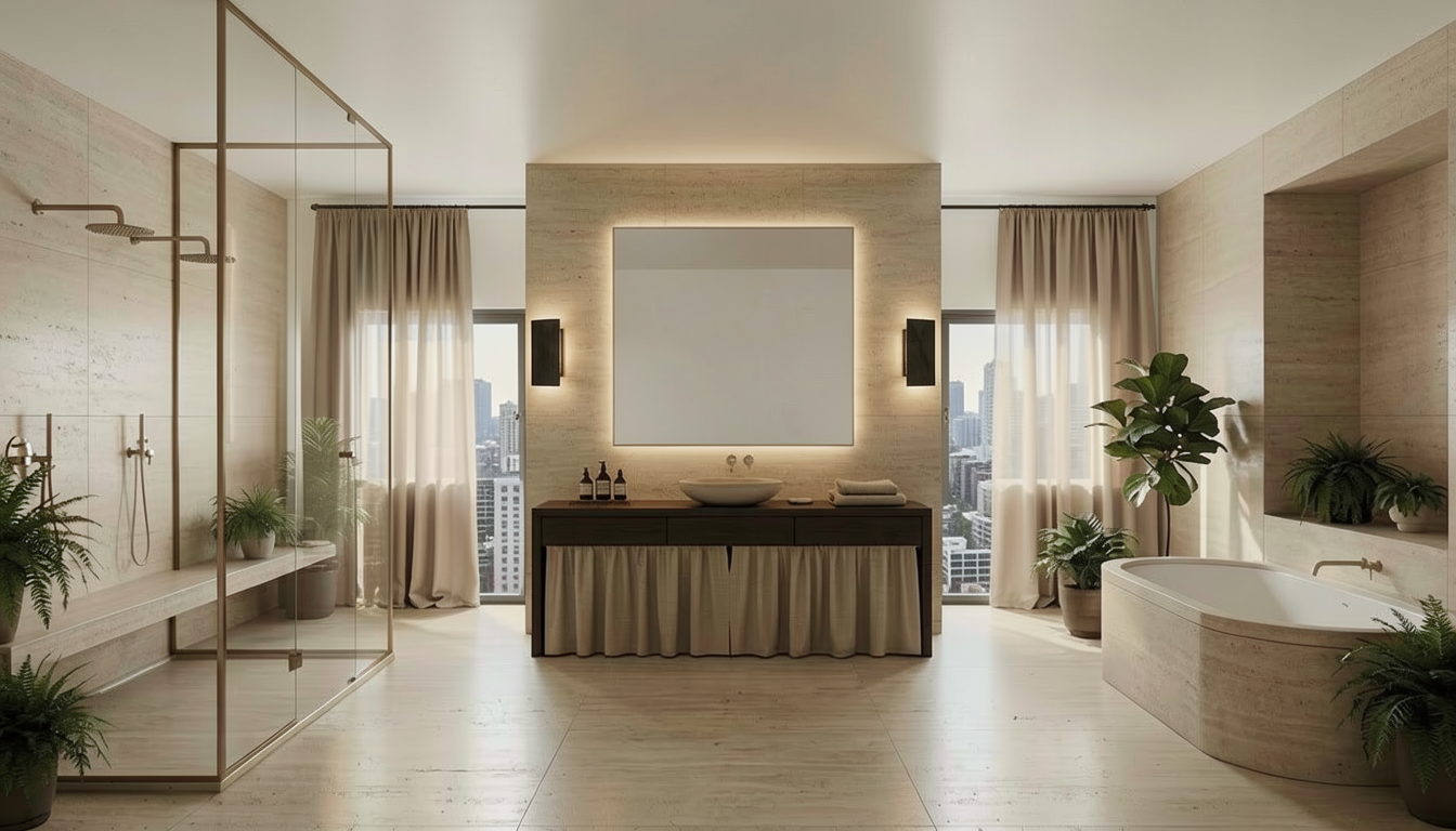 At the center, a dark-stained vanity with a linen skirt anchors the room beneath a large backlit mirror flanked by blackened steel sconces. The warm artificial light layered against the natural city lights filtering through the draped windows behind bathes the entire space in a flattering, soft light that makes every guest feel at home.