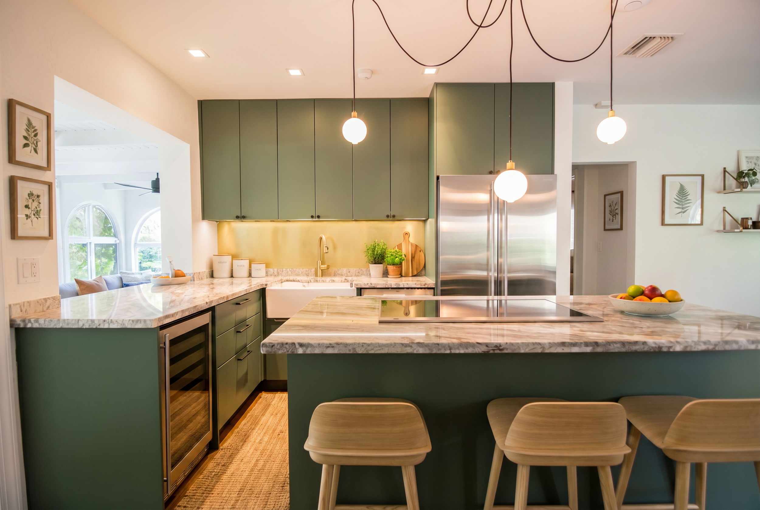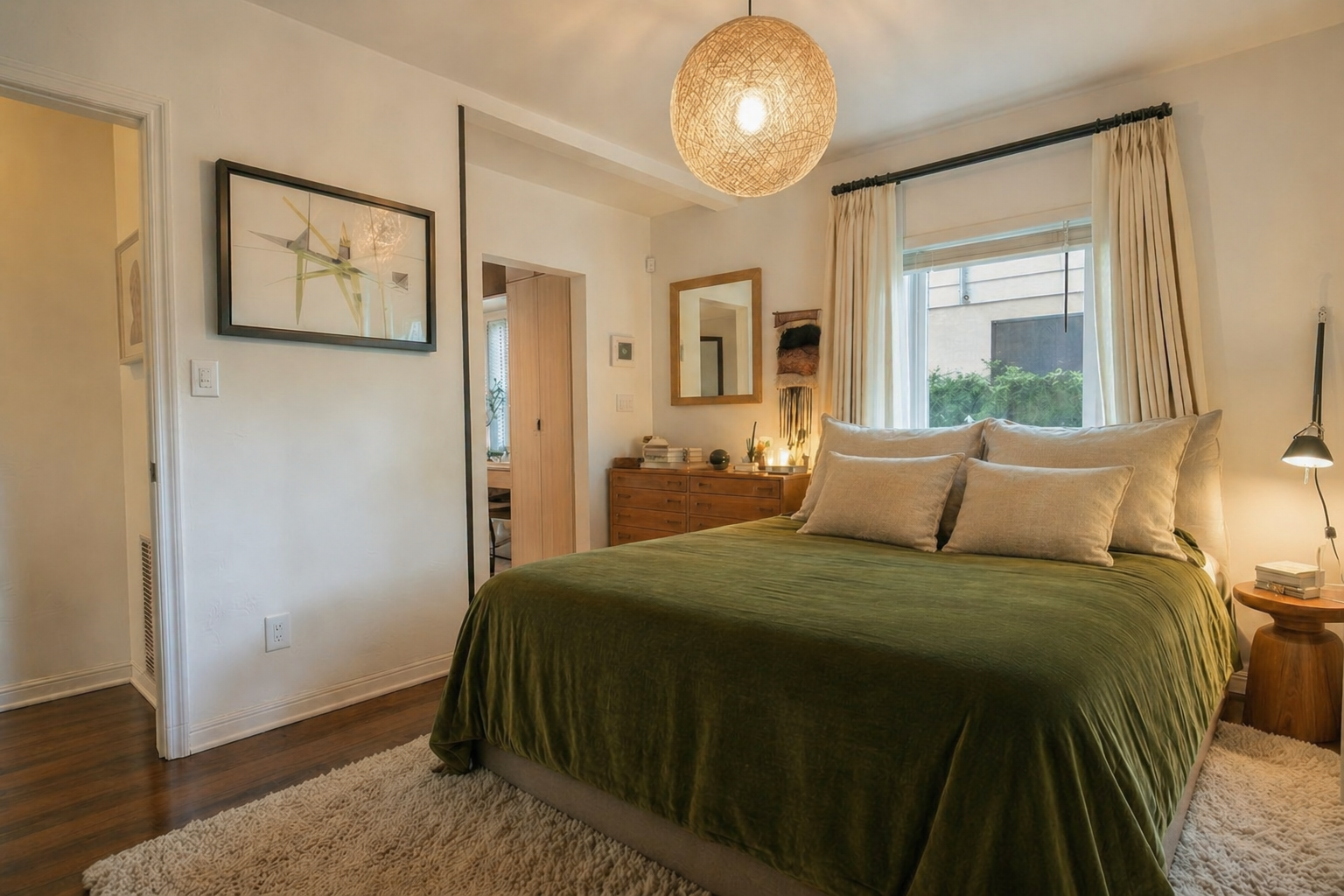 A palette of earth tones is layered with fresh linens, natural fibers, and organic materials such as iron, wood, and natural stone, balanced by clean, modern fixtures in the kitchen, closet, and bathroom areas. Original coral stone and wood floors were retained, adding authenticity and texture, while the Florida room—with its distinctive arched windows—serves as a charming architectural highlight of the home.